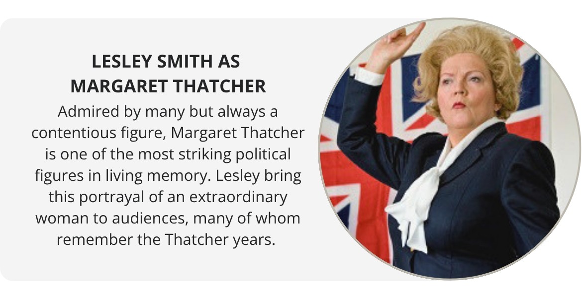 Lesley Smith as Margaret Thatcher - Be entertained by renowned historian Lesley Smith, who brings the era of Margaret Thatcher to life in a lively and insightful performance.